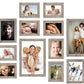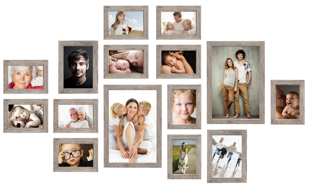Mooie fotomuur bestaande uit 15 fotokaders. Het profiel van deze fotokaders is 2cm breed, een ideale breedte voor tal van toepassingen. Deze fotokaders hebben een grijseiken houtkleur.