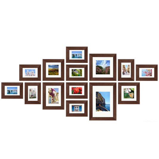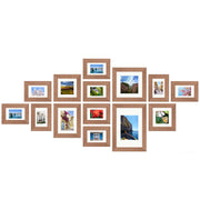 Mooie fotomuur bestaande uit 14 fotokaders. Het profiel van deze kader is 3,1cm breed, een mooie breedte die de kaders echt body geeft. Deze bruine houtlook kaders hebben een nerfstructuur. Elke fotokader is voorzien van een passe-partout.