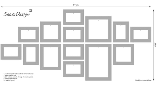Deze set wordt geleverd met een boorgaten template. Dit is een vel dat je op de muur plaatst. Vervolgens boor je door de aangegeven punten en plaats je een schroef of spijkert direct door de aangegeven punten.
