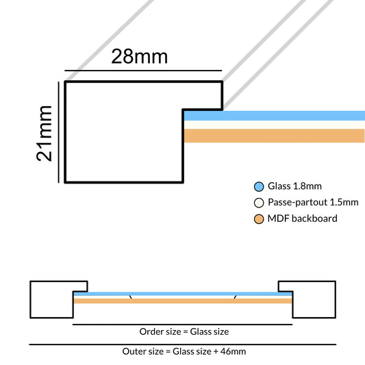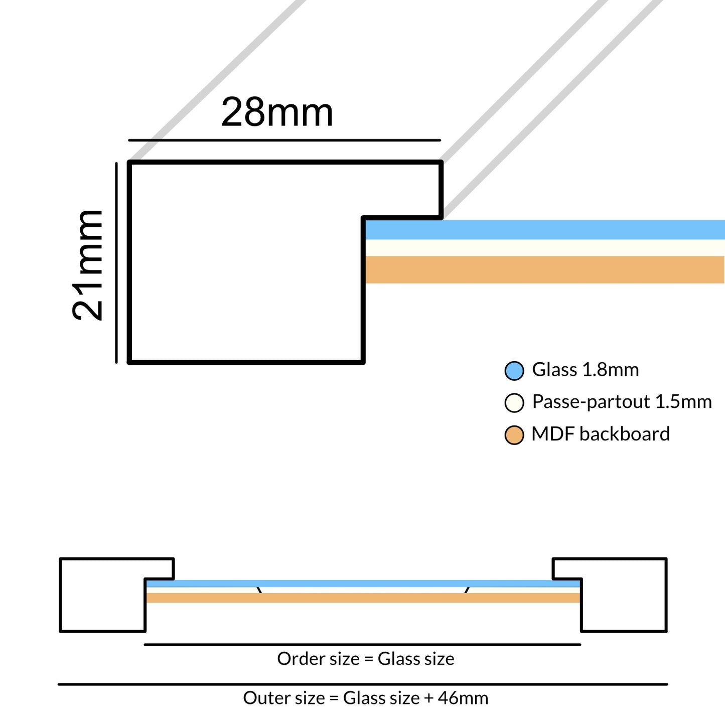 Het profiel is 28mm breed en 21mm hoog. Dit in combinatie helder glas en een neutraal passe-partout maakt dit een mooie keuze.