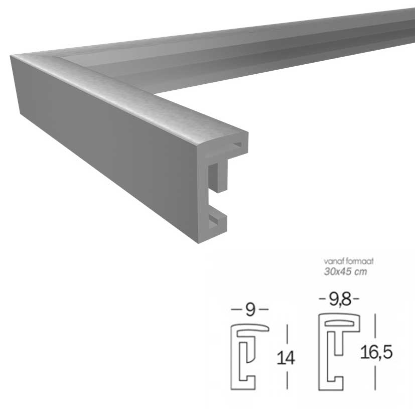 In alle maten zijn deze kaders zowel horizontaal als verticaal op te hangen. Vanaf formaat 30x45 wordt een breder profiel geleverd(zie profieltekening).