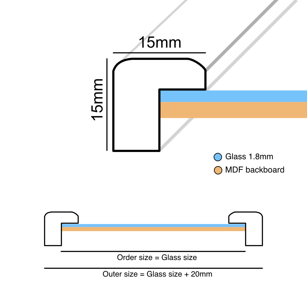 Het profiel met lichte bolling is 15mm breed en 15mm hoog. De fotokader is voorzien van helder glas.