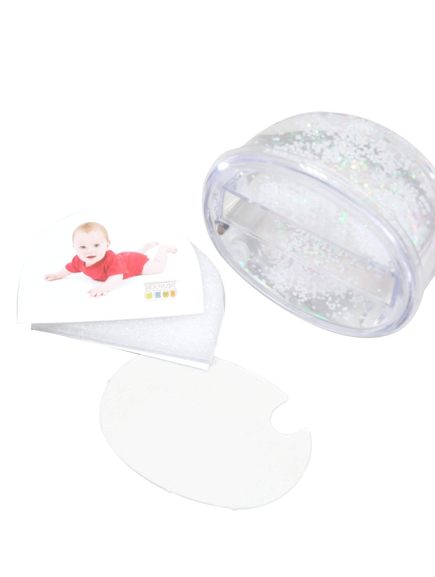Sneeuwbol van Deknudt Frames die plaats biedt aan twee foto’s van 5x7 cm. De transparante schudbol is ongeveer 6,5cm hoog.
